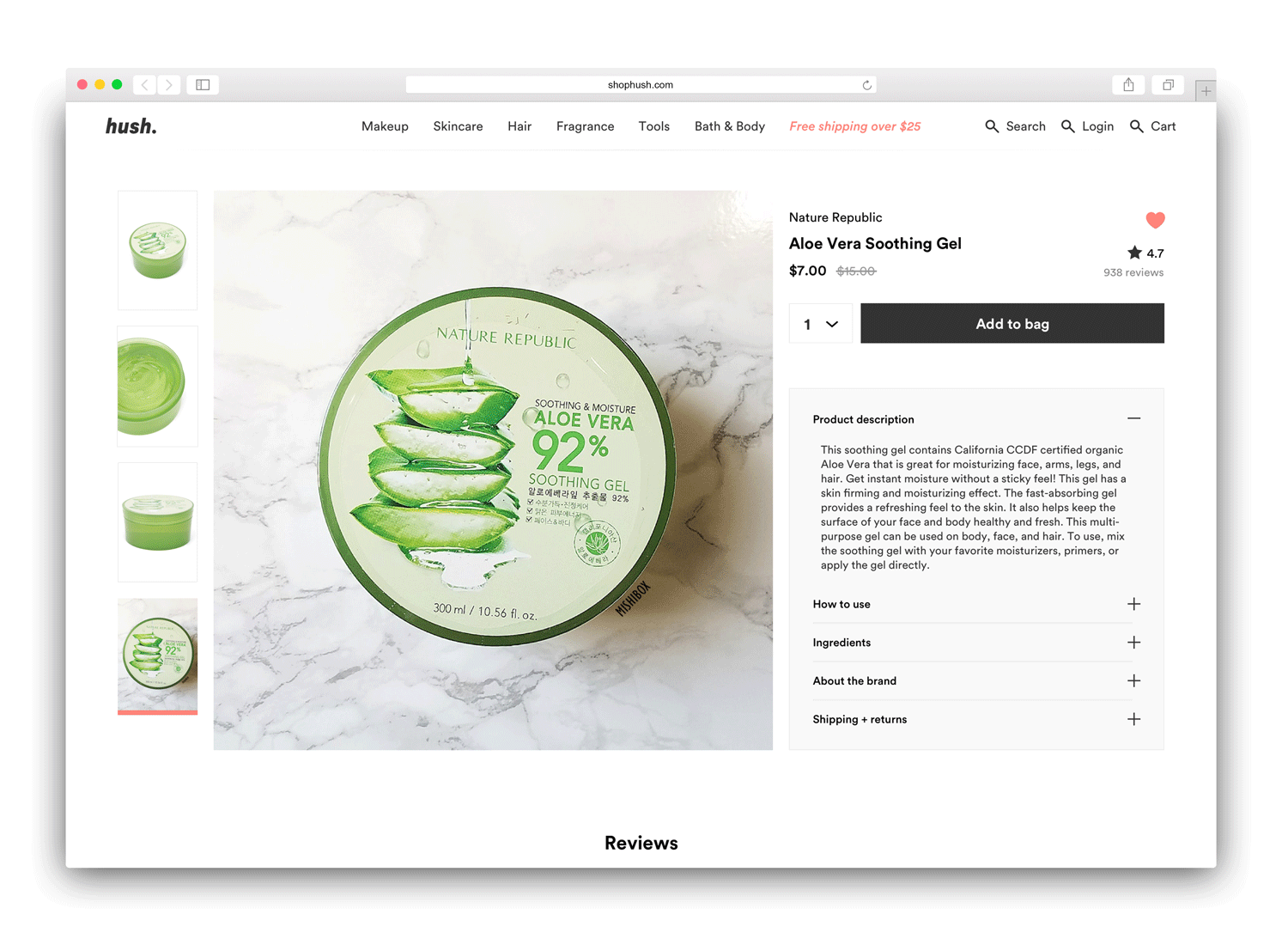 To accommodate a wider range of products and customers, we redesigned Hush’s e-commerce web experience from the ground up. I was responsible for the desktop and mobile product detail pages, cart system, and the reviews portal.